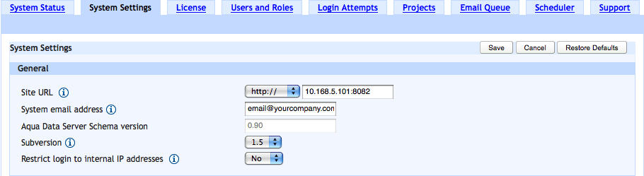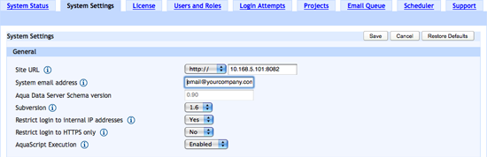 This page discusses Aqua Data Server Site Configuration, which is done in the System Settings tab. All changes to system settings take effect immediately unless otherwise noted.
