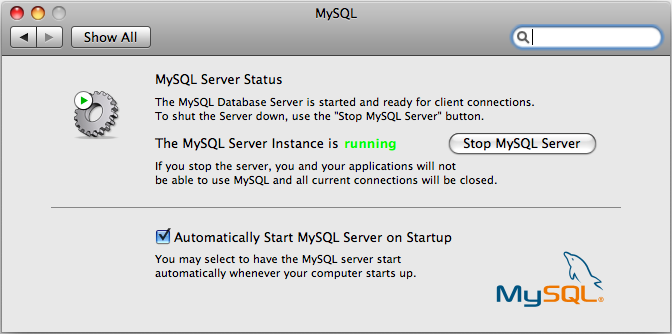 Below displays the preference pane for MySQL which indicates it will start when the system is started.