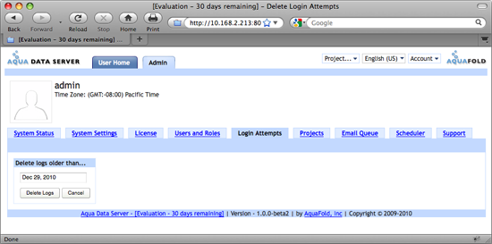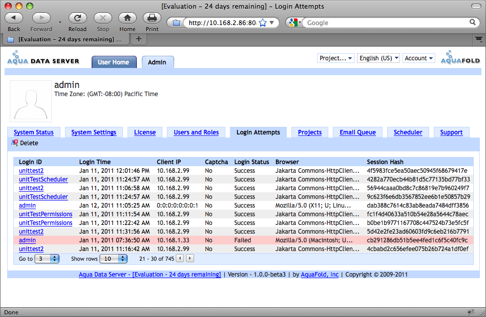 As part of monitoring the overall security of your system, Aqua Data Server provides a history of all login attempts made. Each time a user tries to login to the system, their username and other pertinent information is captured and viewable in the Login Attempts tab. Failed login attempts, login attempts in which either the username provide or the password provided were incorrect, are highlighted in red. You can review this activity to help determine if anyone is attempting unauthorized access. On this page: