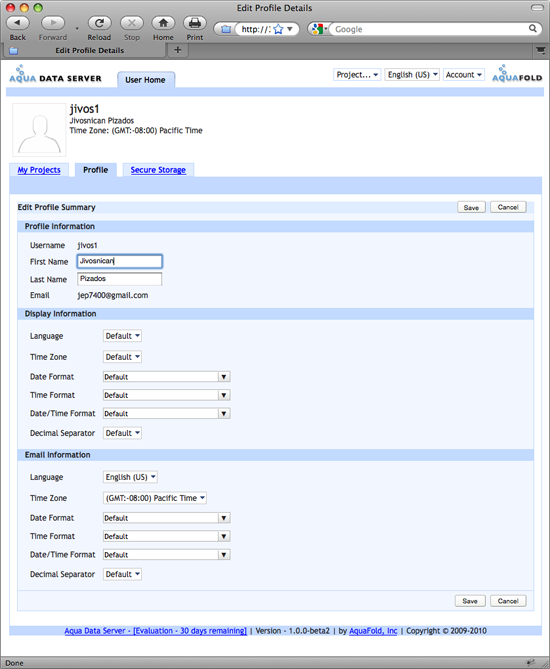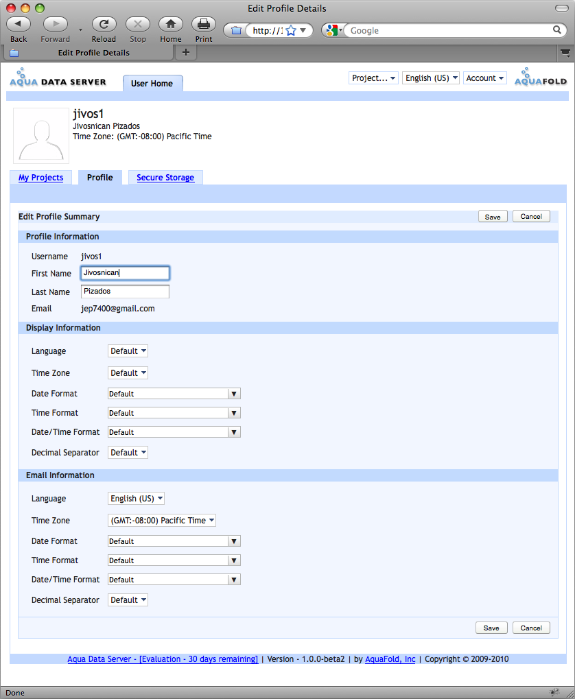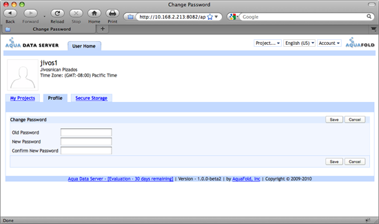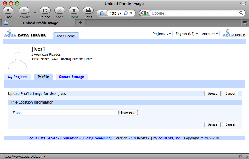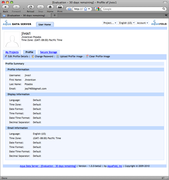buttons allow you to upload or delete your profile image. The profile image must be in .PNG, .JPG, .BMP or .TIFF format and must be smaller than the maximum file upload file size specified in System Settings. During the upload operation, Aqua Data Server converts the image to 100 x 100 size and does not store the original file that was uploaded.