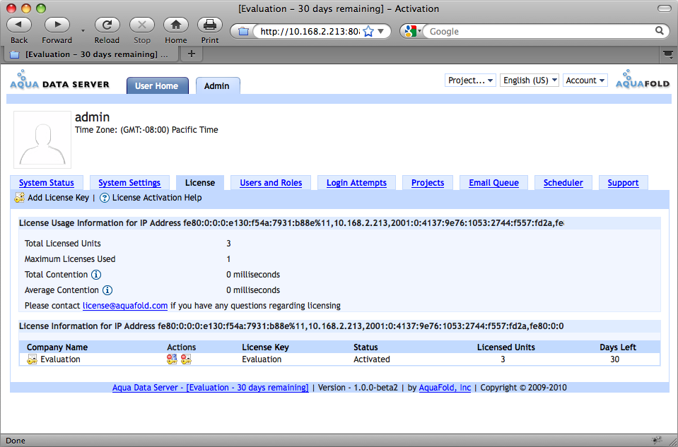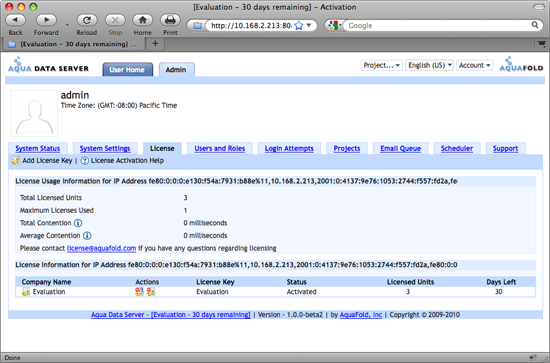 A key administrative aspect of managing Aqua Data Server is ensuring that you have sufficient licenses to cover all activity in the system. License enforcement in Aqua Data Server is based on thread count and is not based on user or processor count. The License Management interface provides a central place to view and manage all of your licensing information. If you have any questions regarding licensing or would like to purchase a license, please contact license@aquafold.com.
