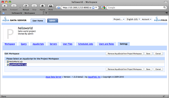 Once an AquaScript is associated with a Workspace Aqua Data Server will automatically invoke the selected AquaScript every time a user accesses the "Workspace" tab of the "Hello World" project.