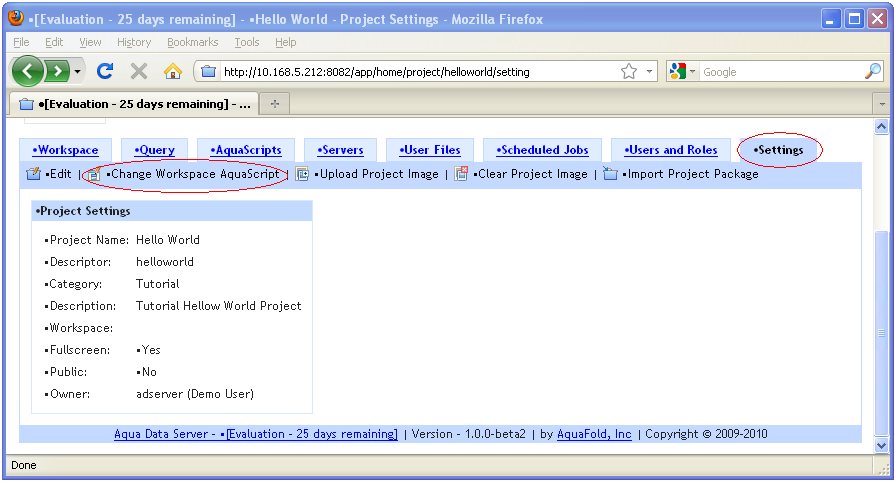 4. Click on the “Settings” tab of the “Hello World” project window and select the “Change Workspace AquaScript” link.