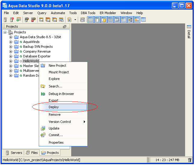 1. Launch Aqua Data Studio and right-click on the “HelloWorld” project folder. In the drop-down menu select the “Deploy” option.