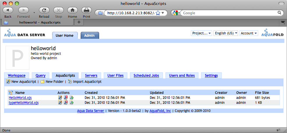 3. Log in to your Aqua Data Server Account and open the “Hello World” project and click on the “AquaScripts” tab. You will see both the HelloWorld.xjs and typeHelloWorld.xjs script files.
