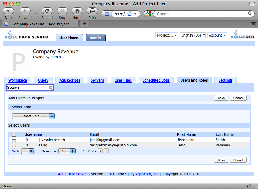 Once you have chosen your users, also specify a role for them using the Select Role dropdown. The role specifies the set of project permissions that the users will be granted. All users will be assigned the same role. Click the Save button to add these users with the specified role. In the next section, we will show you how to change a user's role selection.