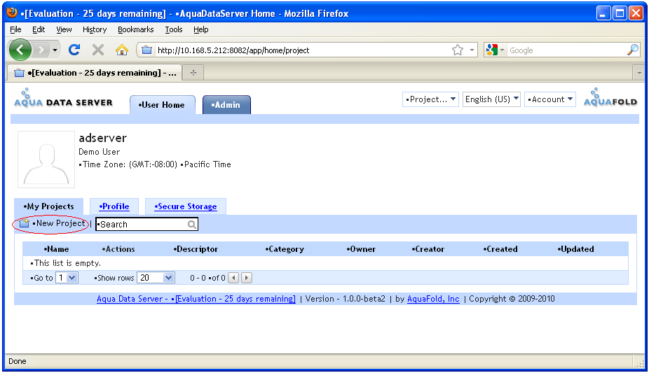 2. In the “My Projects” tab of Aqua Data Server browser window, click on the “New Project” button. If you do not see the "New Project" button, please ask your system administrator to grant you the "Create Project" system permission.