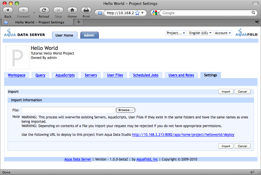 2. On the “Import” page copy the project deploy URL into your clipboard. You will paste this link in Aqua Data Studio.