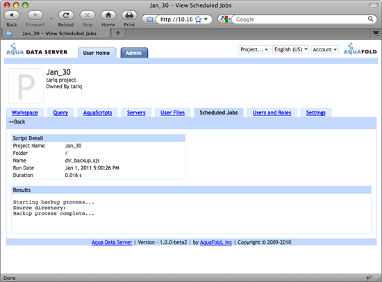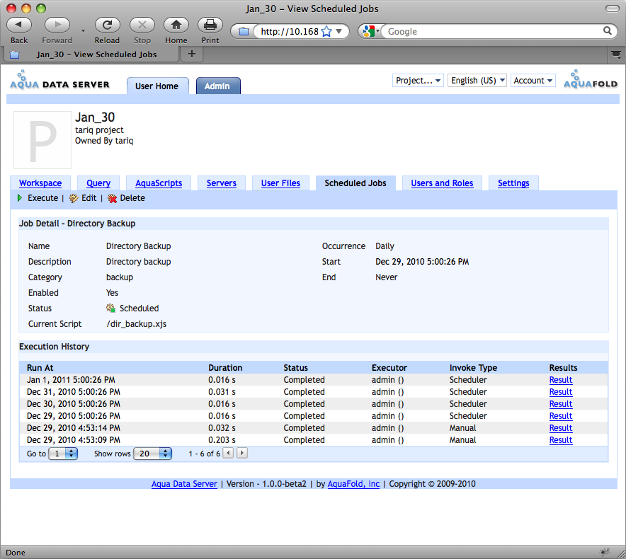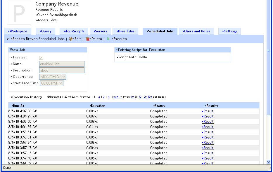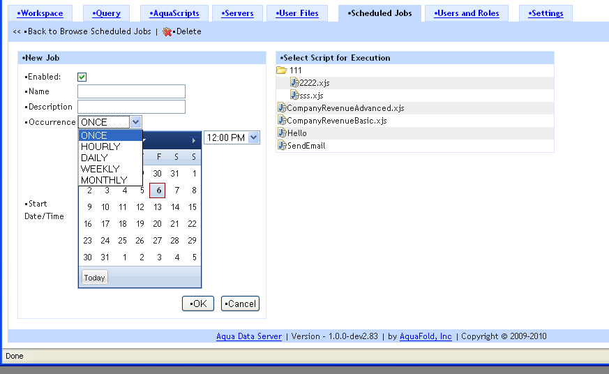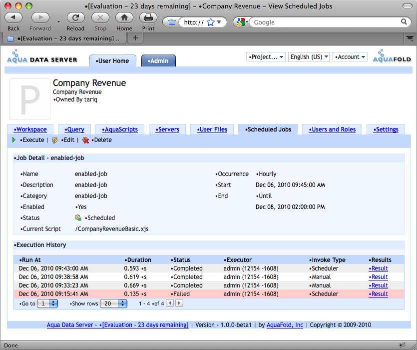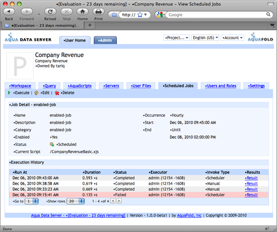 After you have developed production ready AquaScripts, you might want to execute some of them on a periodic basis or in a background thread. Aqua Data Server's scheduled job functionality is designed to address these requirements. In a scheduled job, you specify the AquaScript to run and how often the AquaScript should be executed. Aqua Data Server's Scheduler engine automatically invokes the AquaScript at the designated time. Once the script is finished executing, you can view its execution history and its results. One use case might be that you need to send a daily status report on the number of outstanding orders. You could create an AquaScript that queries the database to get the number of outstanding orders, graph the data, embed it inside of excel and emails it to your manager all using the Aqua Open APIs. You could then create a scheduled job to run this report on a nightly basis. On this page: