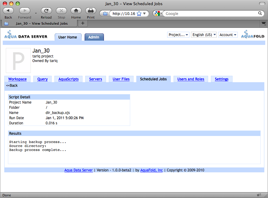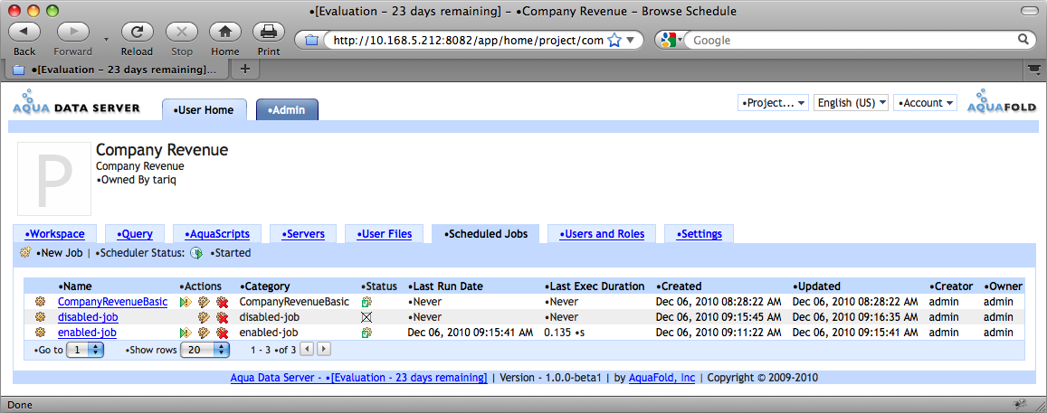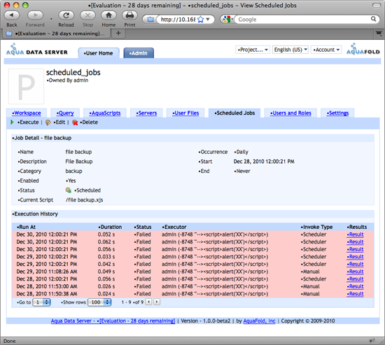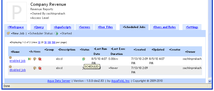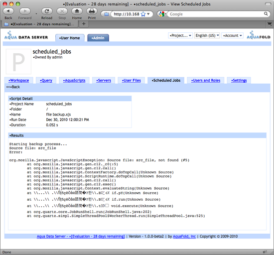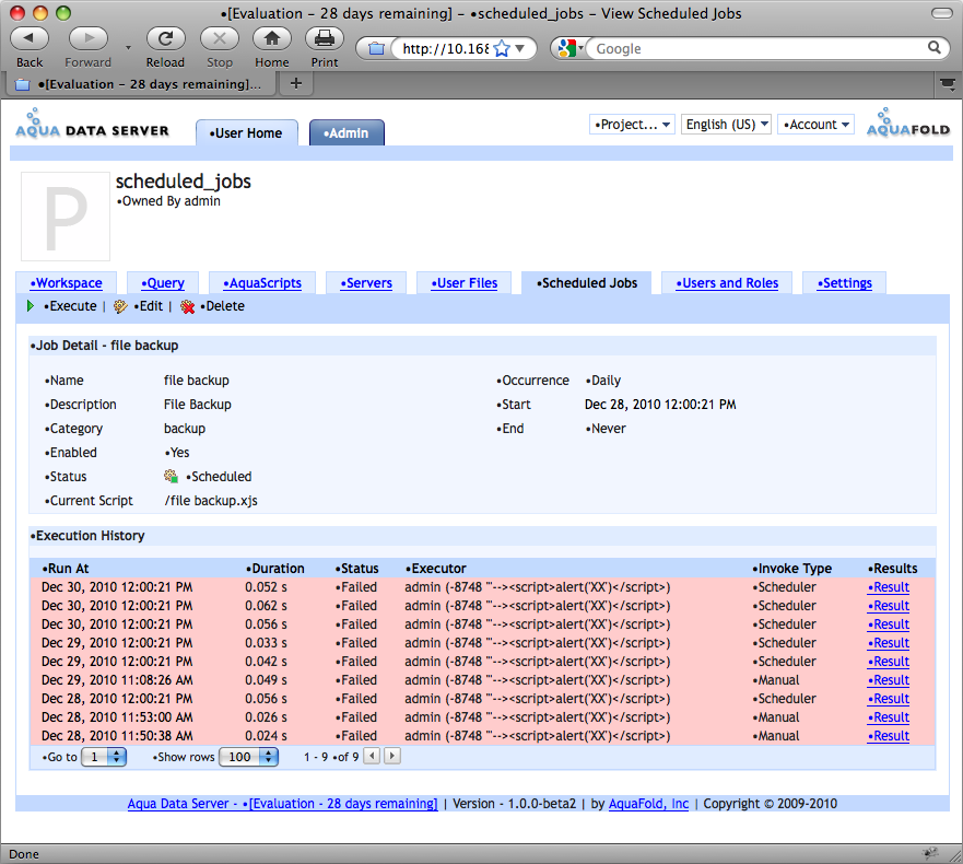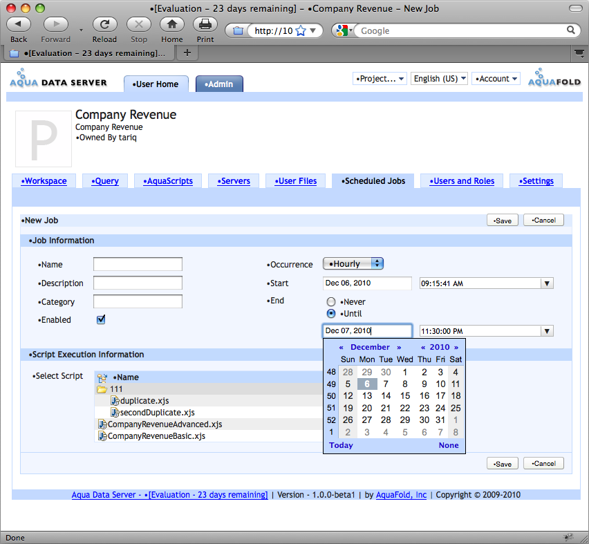 After you have developed production ready AquaScripts, you might want to execute some of them on a periodic basis or in a background thread. Aqua Data Server's scheduled job functionality is designed to address these requirements. In a scheduled job, you specify the AquaScript to run and how often the AquaScript should be executed. Aqua Data Server's Scheduler engine automatically invokes the AquaScript at the designated time. Once the script is finished executing, you can view its execution history and its results. One use case might be that you need to send a daily status report on the number of outstanding orders. You could create an AquaScript that queries the database to get the number of outstanding orders, graph the data, embed it inside of excel and emails it to your manager all using the Aqua Open APIs. You could then create a scheduled job to run this report on a nightly basis. On this page: