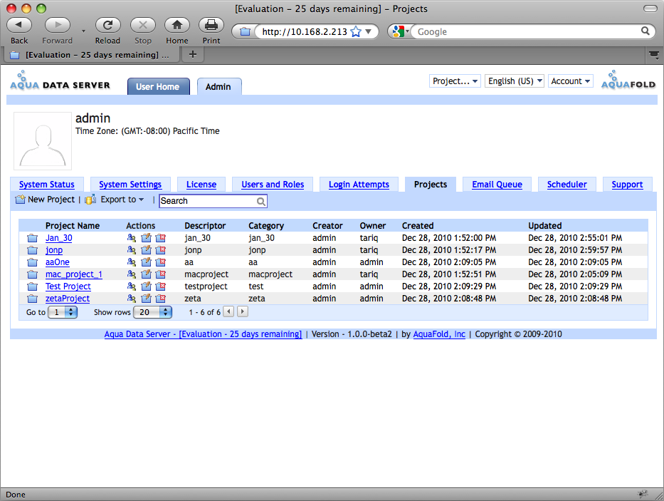 When large lists are generated Aqua Data Server paginates the results and displays a Pagination Navigator at the bottom of the list. Using the Pagination Navigator, it is possible to go to a page of results, select how many rows appear per page, or click forward and back through the pages. In the screenshot below, we are viewing page 2 of a list of Projects. We currently show 10 rows per page. The cursor is selecting from the dropdown to swap from showing 10 rows per page to showing 50 rows per page.