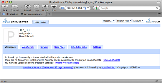 When a user navigates into a Project by either clicking on a particular project in their My Projects list, or by using the Projects Dropdown, the Project Name, Category and Description along with the Project Image are displayed (if one has been uploaded). Below, a user who does not have permissions to see the Admin tab has navigated into the Jan_30 project. The Jan_30 Application Tabs this user has permissions to see are Workspace, AquaScripts, Servers, User Files, Scheduled Jobs and Settings.
