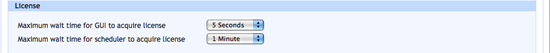 Timeout when license acquired for a scheduled action (when an AquaScript is executed by the Scheduler). Set as 15 seconds, 1 minute, 5 minutes, 30 minutes or 1 hour. If a license is not acquired within the specified amount of time, the scheduled AquaScript execution fails and an error is logged in that job's execution history. The log can be viewed by clicking on the job's name in the Project->Scheduled Jobs tab, or Admin->Scheduler tab.