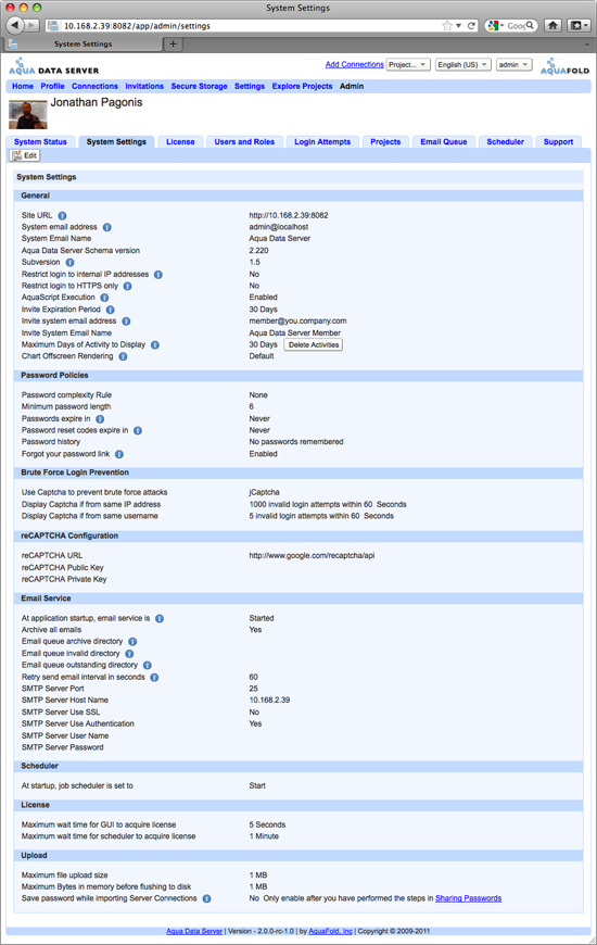 The Admin -> System Settings tab provides a central place to configure Aqua Data Server. This tab displays all system settings that can be configured via the application GUI. We recommend that you perform this configuration immediately after successfully installing the application.