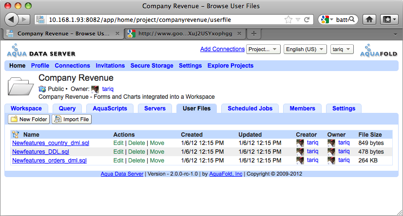 As you are developing AquaScripts, you may encounter the need to read from property files, dynamically generate binary files or modify existing files. All this is possible using the Aqua Open APIs. Similar to accessing Server connections from your AquaScripts, you can programmatically read and write to your project's User Files directory. The User Files tab gives you a graphical view of the what is currently in the User Files folder and lets you import new user file as well.