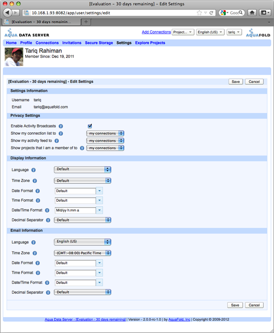 These settings determine what Interface Language, Locale, Date/Time Format and Decimal Separator the user will see throughout Aqua Data Server whenever they are logged in. See the Locale Settings - Language, Date or Time section for details on how to create custom Date/Time Formatting.