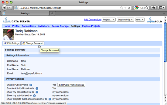 If a user needs to change their password, they access the Change Password button by clicking Edit Settings. The Change Password Button will appear at the top of their settings in the Action Bar.