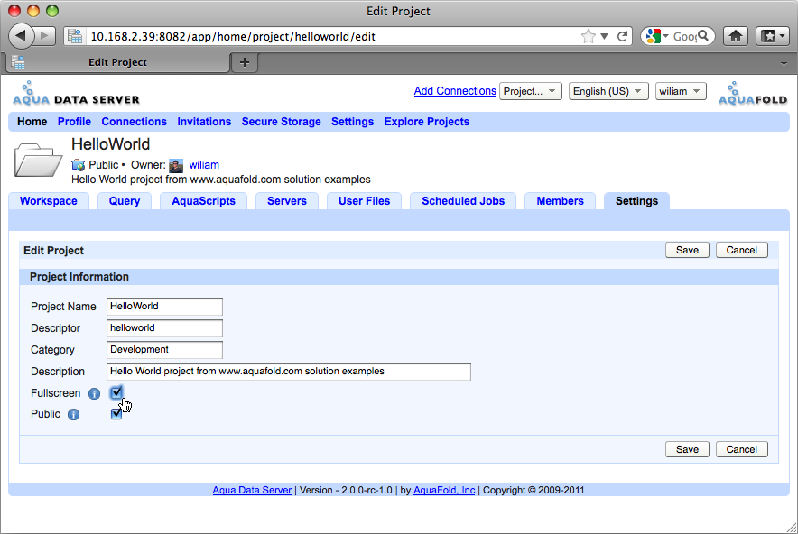 When creating a project, you will need to define a project descriptor. The descriptor defines the unique name to be used in the URL naming. For example, the project with a descriptor of "aquafold_project", would have a URL entry point of "http://localhost/app/home/project/aquafold_project".