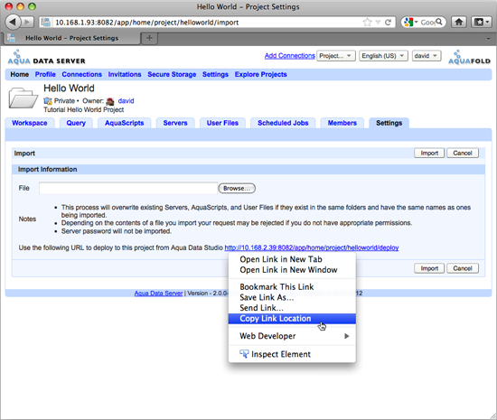 2. On the “Import” page copy the project deploy URL into your clipboard. You will paste this link in Aqua Data Studio.