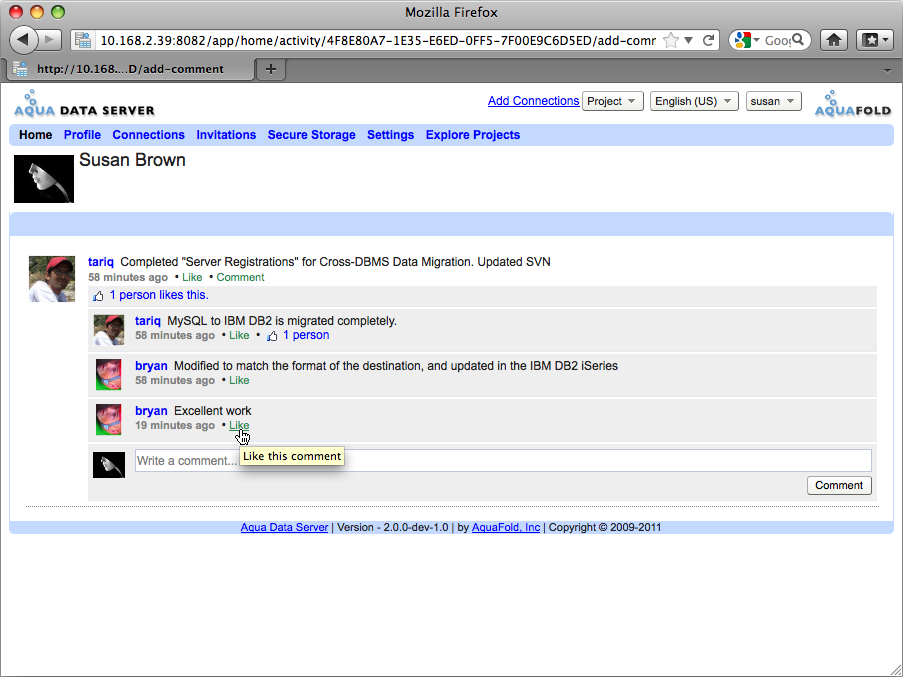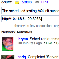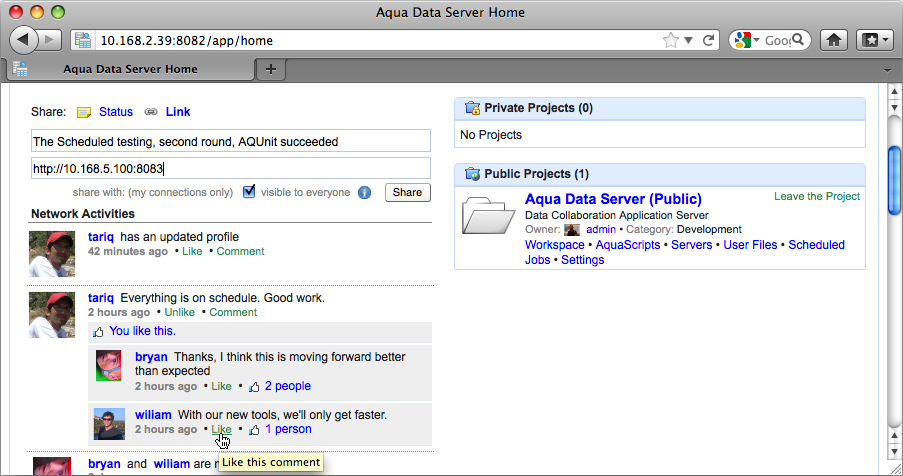 With version 2.0 of Aqua Data Server we have added a Network Activity feed to every user's home page allowing users to post a status update, share a link and comment on or like a post.