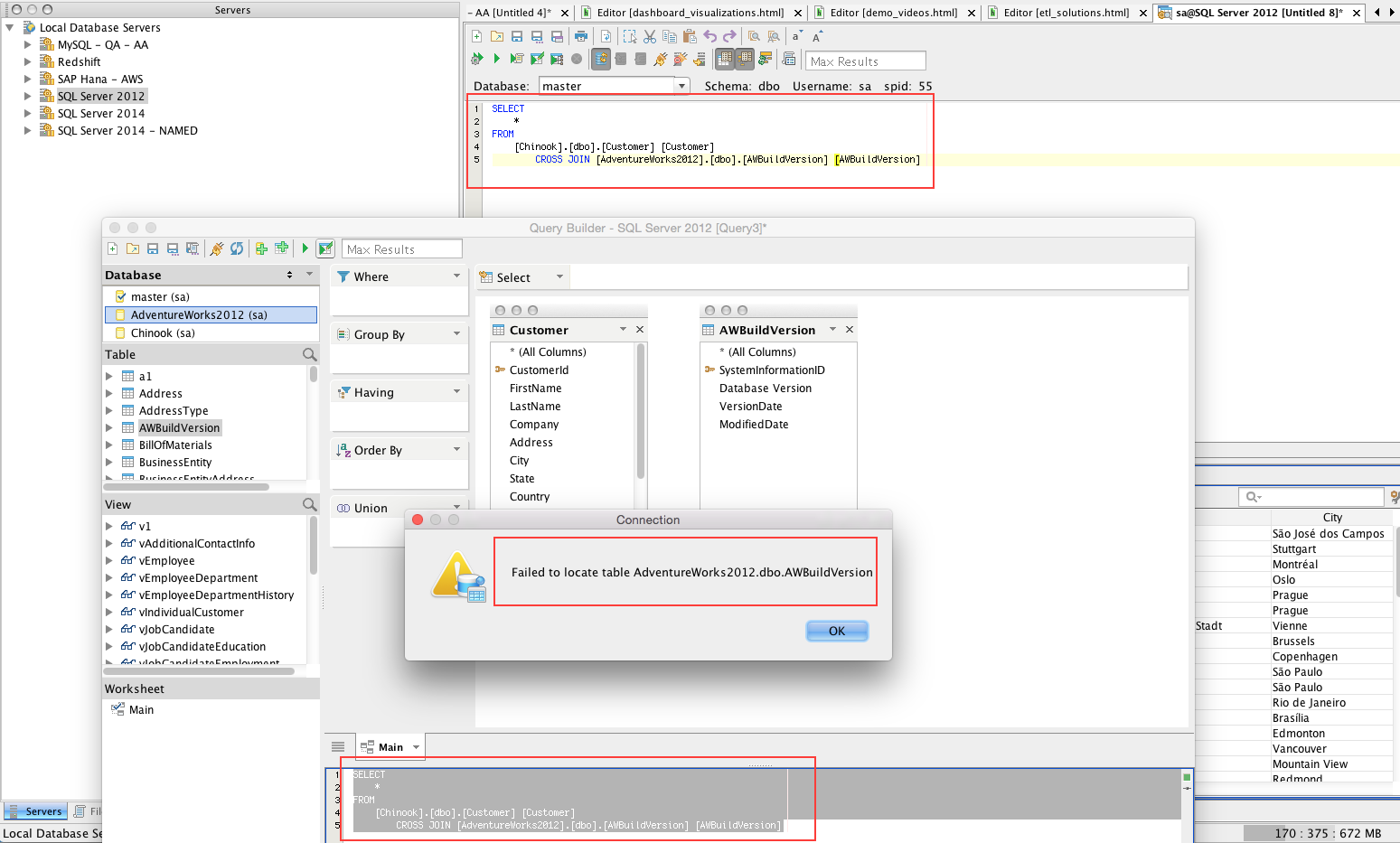 If we have a query in the query builder which queries tables from multiple databases, then the Execute Edit will fail. If you take the SQL and put in a Query Window and execute edit, then it will succeed. The table extraction for execute edit in the query builder seems to assume that both both tables are always in the same database, which is not correct. We need to make the query builder behavior similar to the query window behavior.