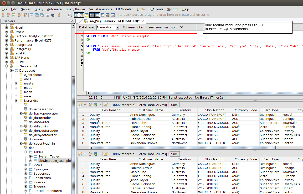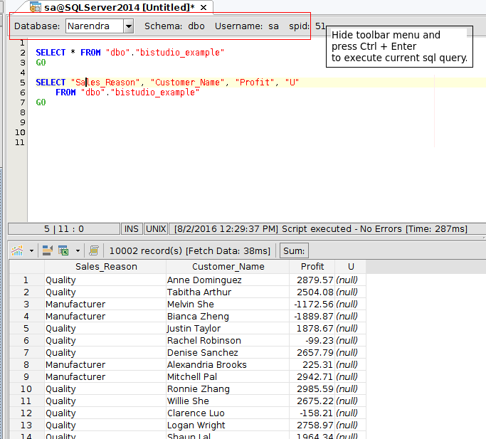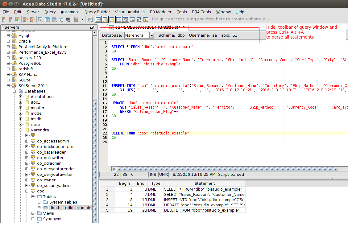 Tested in Windows box and with 17.0.1-3, the SQL query is executed successfully. Tested in SQL Server, Sybase, MongoDB. Also verified the 4 cases with MongoJS as Ivan had commented.