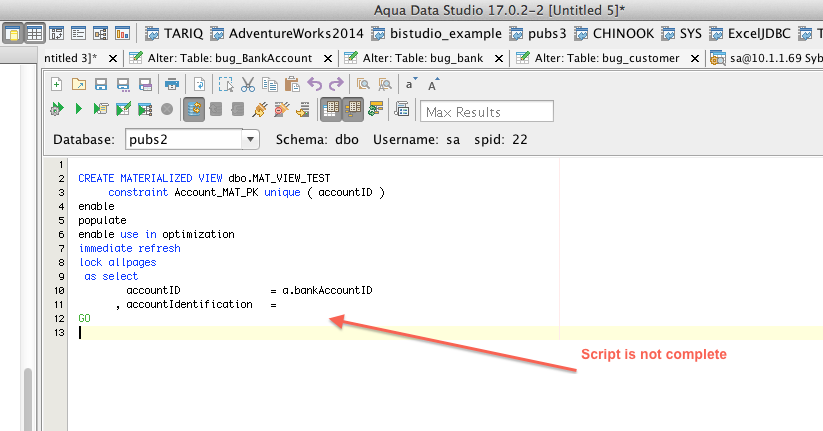 Sybase ASE Materialized View: ADS does not script the complete DDL