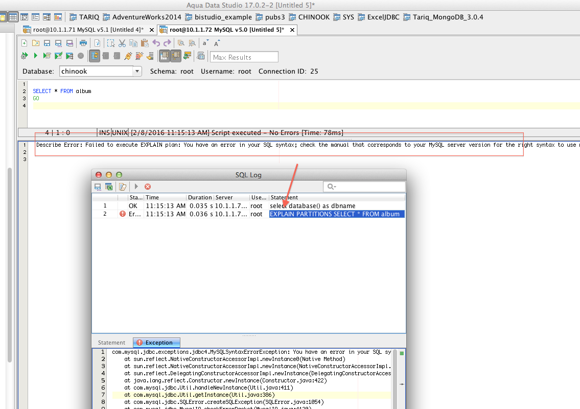 5. Under ADS -> SQL Log you get exception in Explain Partitions query as below