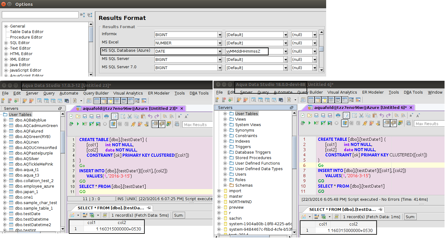 As mentioned in this issue comment, it is the File -> Options -> Results Format dialog that didn't function correctly for Azure. When you set the formats, they were not saved.