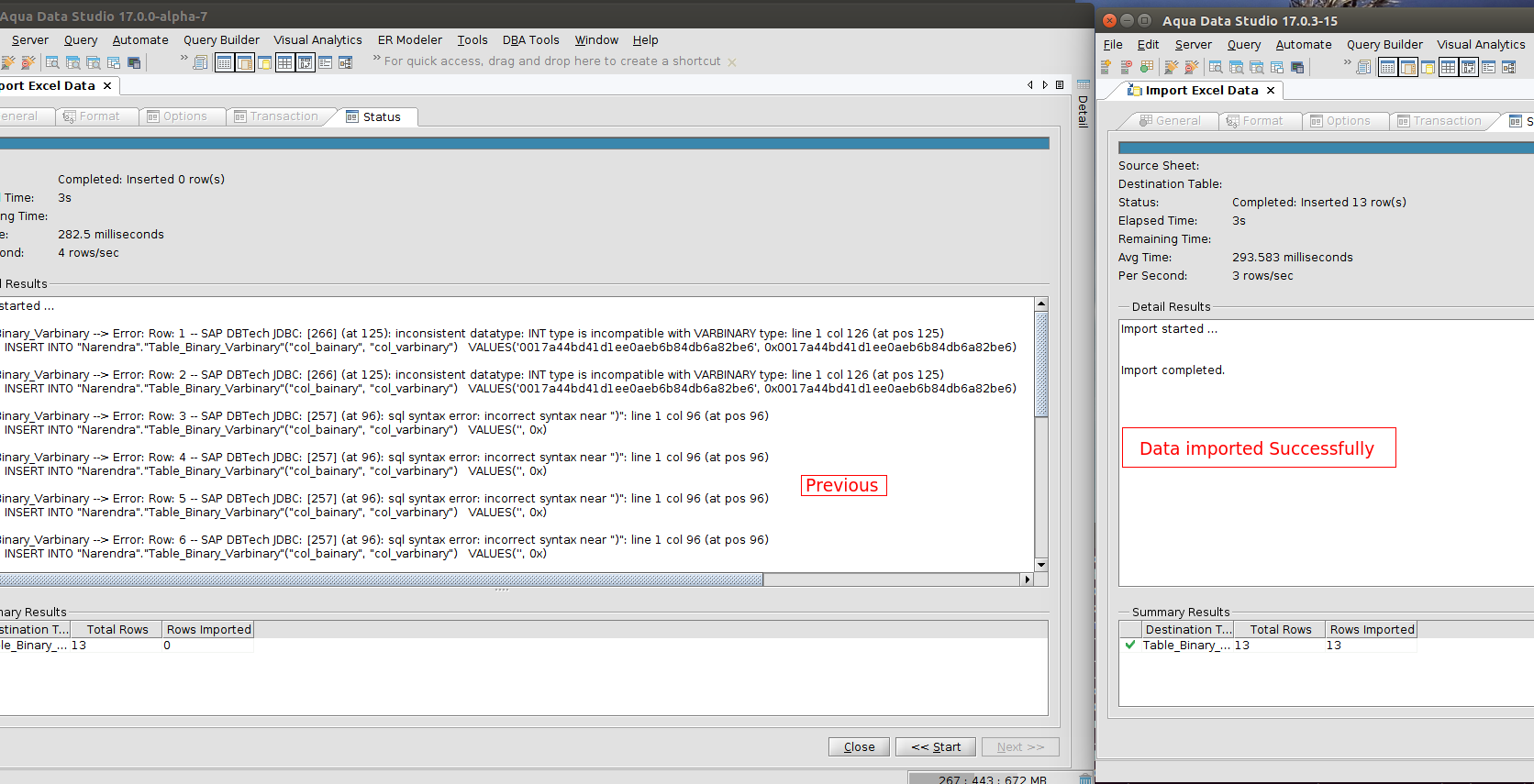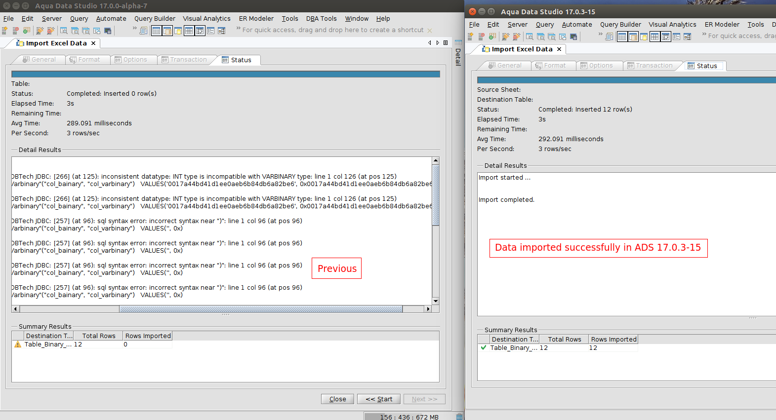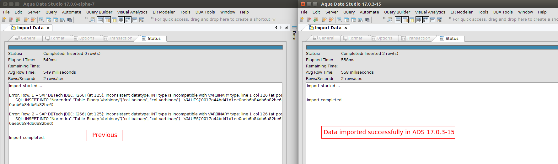 Modification made to the import thread to handle the binary datatype as a string quoted column.
