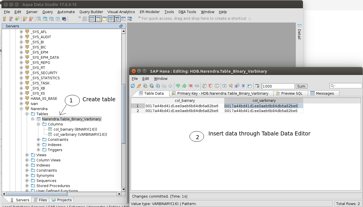 We are using the HEXTOBIN(<String>) database function to work with the binary datatype. This was required in order to correctly compare the string in the WHERE Clause. If the user disables the File->Option->Results->Data Retrieval -> [Convert Binary to hex], attempting to modify the binary code using table data editor will fail.