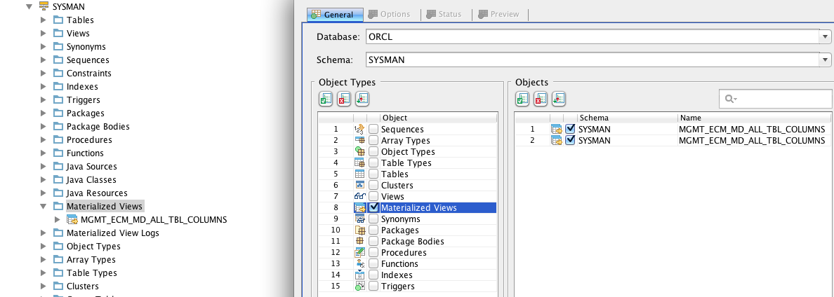 Check under Oracle 11g SYSMAN schema and use Script Generator to script the MAT View named MGMT_ECM_MD_ALL_TBL_COLUMNS and you can see that it is displayed twice.