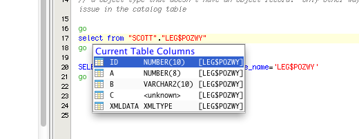 Oracle datatype extraction has been adjusted so that if a null value is returned from the catalog tables, datatype will be replaced with <unknown> string. This fixes the tree node so that a column with null datatype will display. This fixes the auto completion popup so that the column will display with <unknown> as the datatype. During scripting of the DDL the type will script as <unknown>; a user will have to modify this value for the DDL to work but the column will script.