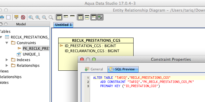 When scripting a constraint in the ERM the constraint schema and name do not get scripted. class ScriptConstraint.scriptCREATE() method determines if the schema name and constraint name will be scripted by the variable includeTableConstraintsNames. This variable is passed to the method EConstraint. Its retrieved from the class ScriptFormat. In script format a boolean varaible includeTableConstraintNames is declared but not set, so default will be false. This class has a method setIncludeTableConstraintNames() this is only ever called from the CompareView class. This means the only time the constraint schema and name will ever get scripted is if the compareView class is part of the scripting. You will notice that in version 13 the constraint names where been scripted and as of version 14 they stopped getting scripted in the ERM.