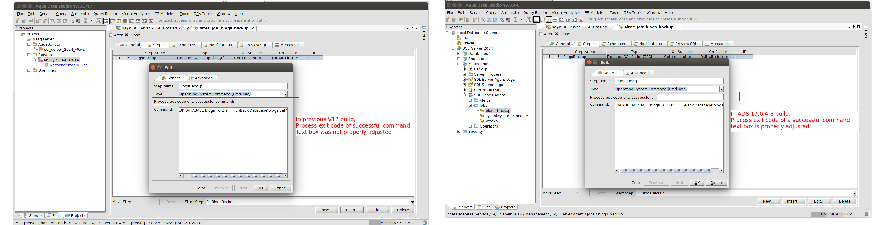 Use a SQL Server connection. In the tree, go to the Management -> SQL Server Agent -> Jobs and alter a job. In the Alter Job gui, go to the Steps tab and edit a step. If the step command is a long single line text, the scroll bar popups up and causes the Process exit code of a successful command text box to drop down a line, and under the command text. This causes the gui to be unusable to the user.