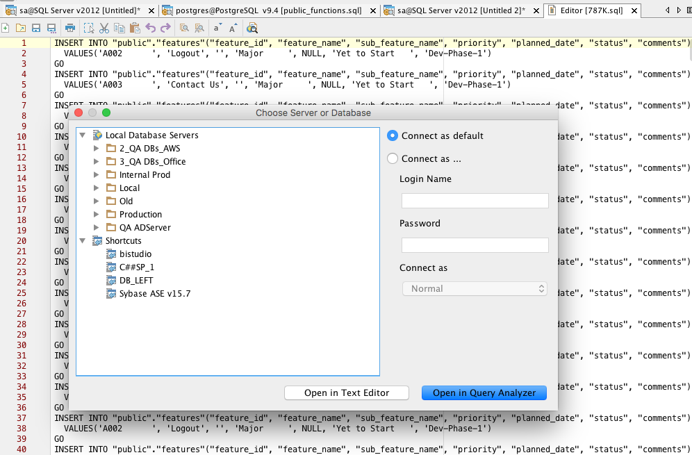 Now when files with SQL file type (.sql, .proc, .tsql, .plsql, etc.) are opened in text editor from the "Choose Server or Database" dialog, a sql-generic highlighter is applied to the editor.