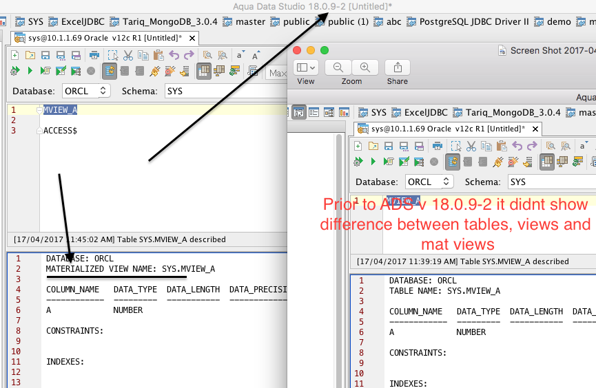 Auto-Describe (ctrl-D) doesn't indicated the object type for a description, indicating Table, View or Materialized View.