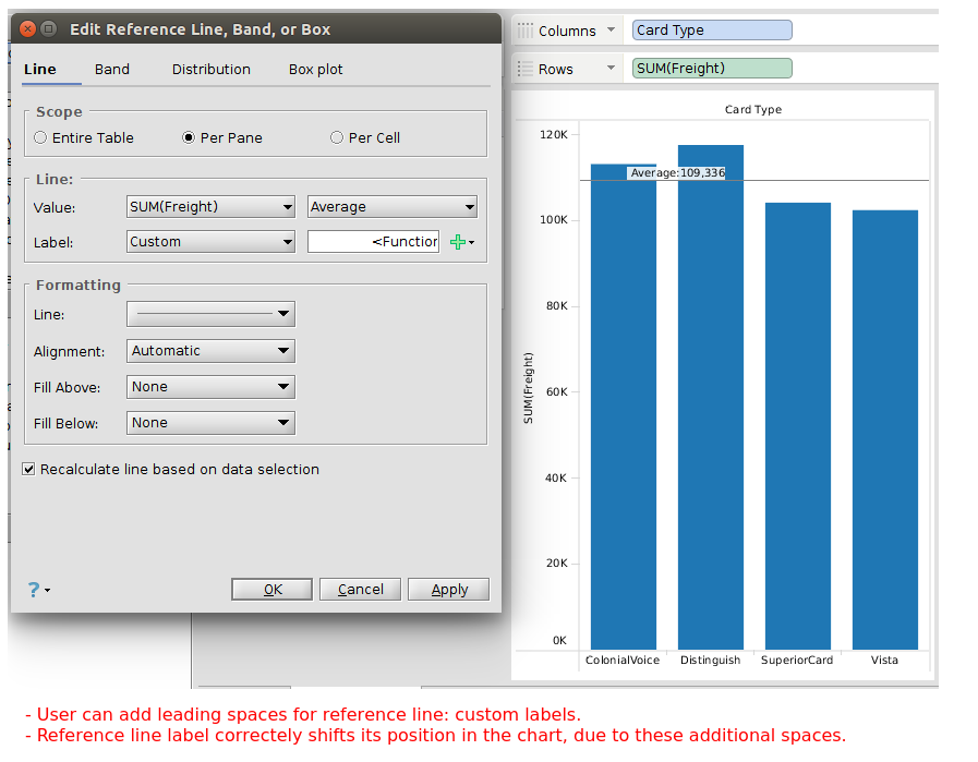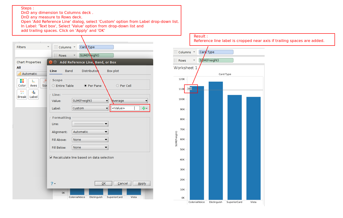 1) I tried to use Edit Reference Line > Label > Custom. And then add some leading spaces in the text box along with <Value>. The issue is that the leading & trailing spaces are trimmed. Lets introduce a way for the user to add leading & trailing spaces