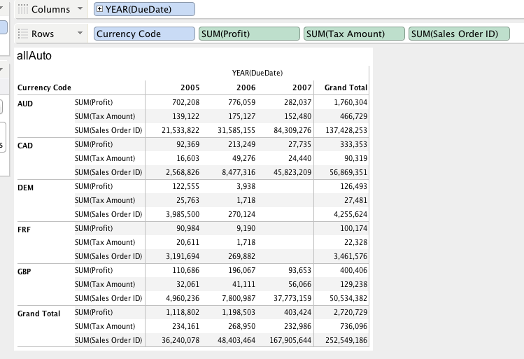 - If Automatic is selected for all measures, no aggregation is displayed.
