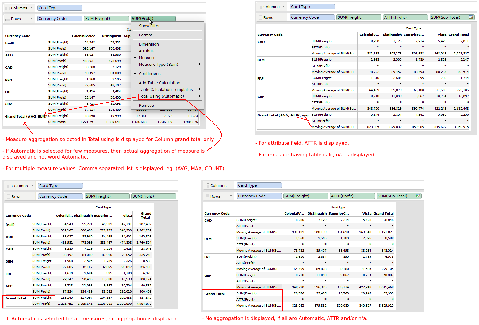 b) Grand Total label: Display measure aggregation selected in Total using submenu next to grand Total label.