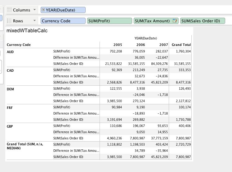 4) Grand total cell now displays grand total summary types in short form (as in row/col decks) (image). If the user applies table calculation, the summary defaults to automatic and will display appropriate automatic summary.