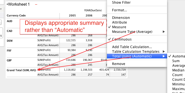- If Automatic is selected for few measures, then actual aggregation of measure is displayed and not word Automatic.