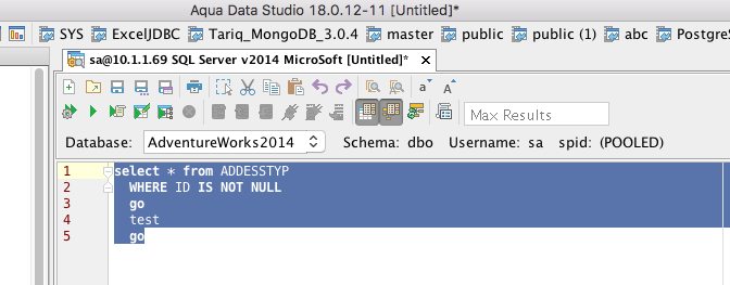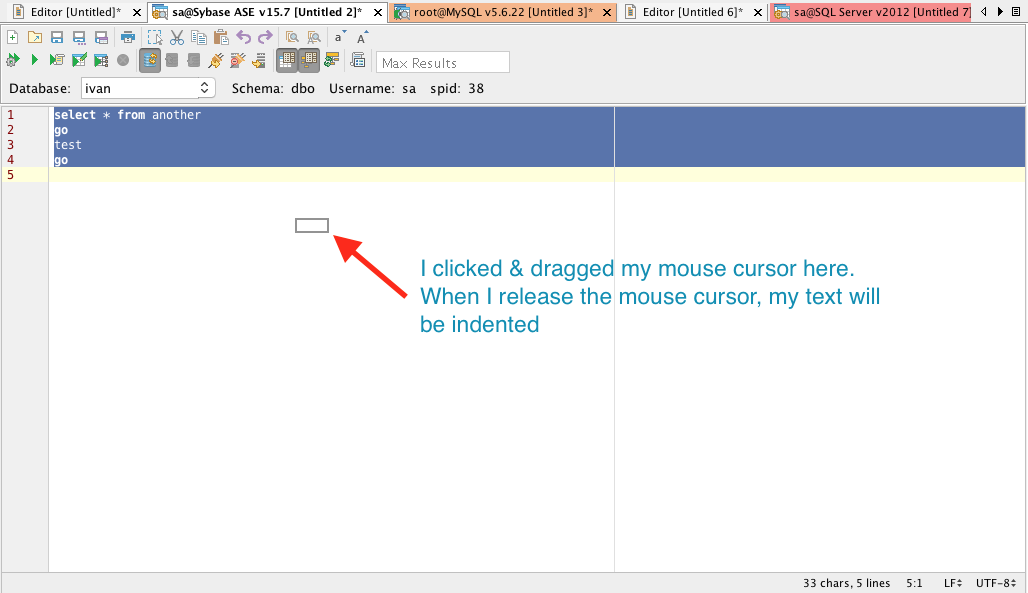 In the ADS v18 editor, highlight some text in SQL tab (or any other tab). Then, click & drag the selected text, as shown in the screenshot. The text gets indented.