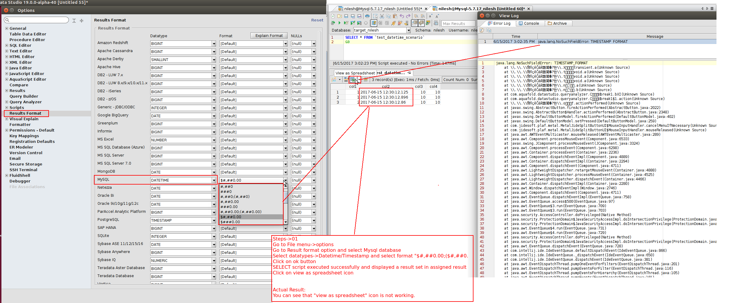 Go to Result format option and select Mysql database