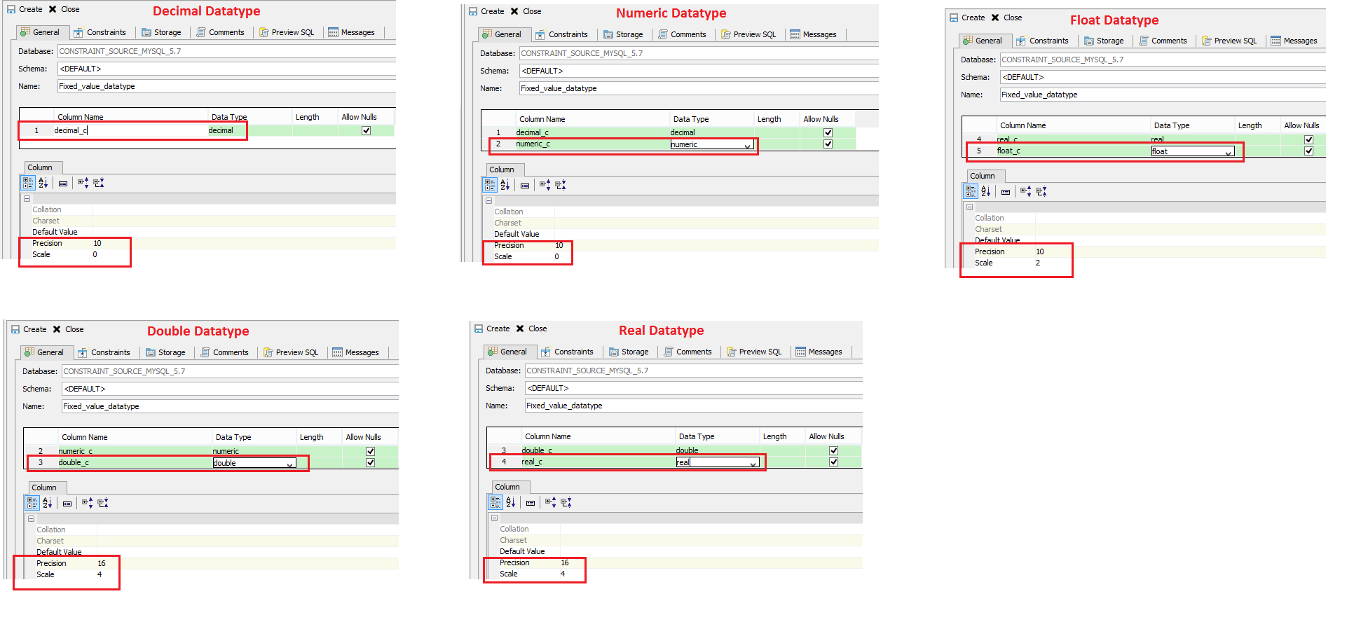 svn #54753 - Set the default values for precision and scale for the real, float and double datatypes.