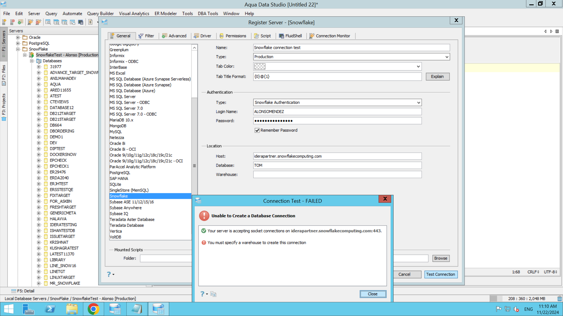 I have tested this on Aqua Data Studio 24.1.0-rc-1 and this behavior persists. When it is not specified the Warehouse on the connection I receive the error indicated on the screenshot "SnowflakeConnectiontest".