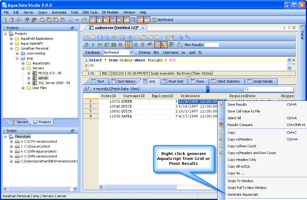 Generate AquaScripts from Grid and Pivot Grid Results: To simplify the AquaScript creation process, Grid and Pivot Grid Results can be converted into AquaScripts with a right click on their results tabs in the Query Analyzer. When the AquaScript is created, the user is prompted for a Project to put the script in. Aqua Data Studio will display these contents in a web browser if the script is Debugged in Browser. After creating Pivot Grid Charts or Grid Charts, right clicking within the chart allows selecting Generate AquaScript to automatically create a script for reproducing it.