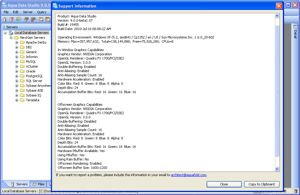 When contacting AquaFold with support issues, use the application menu Help > Support Information then click the 'Copy to Clipboard' button. Paste the copied information with a detailed description of your problem (including as much information as possible about the database vendor and version you are connecting to) in an email to architect (at) aquafold.com