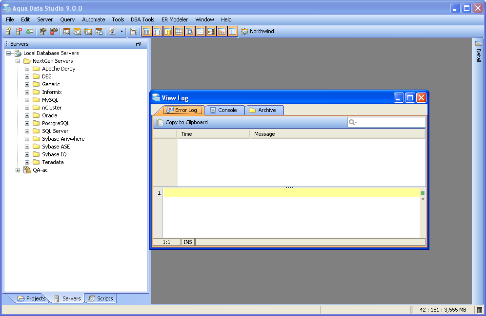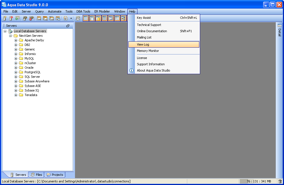 The View Log window provides three tabs for examining logs, errors and actions taken by Aqua Data Studio. This is useful for troubleshooting issues and support questions, and monitoring server connection status. The Logs and Support information can be found under the main application menu item Help
