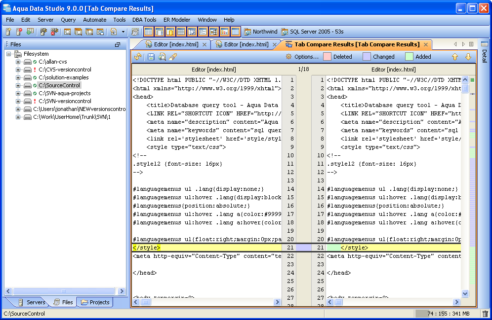 Launching the Tab Compare Tool The Tab Compare Tool provides users a method of depicting differences in the content of application tabs. To compare two application tabs, either right click in one of several open tabs, or launch the Tab Compare Tool from Tools Menu (Tools->Compare->Tab Compare) and choose two tabs out of the list of tabs. If the Tab Compare Tool is launched from the Tools Menu, it is possible to choose tabs that are not immediately visible in the application window, but are open. When the comparison is being performed it runs in a background thread so that other operations in Aqua Data Studio can be performed. Comparison Results The results of a comparison display as a split-pane with line numbering down the center and connecting splines for identifying where the deletions, changes and additions occur. Each tab in a comparison takes up half of the comparison results window and each can be vertically scrolled independently of the other. At the top, between the two tabs above the line numbering, digits separated by a / indicate the difference selected out of total number of differences discovered (i.e. 9/27). The large up and down arrows at the top right of the comparison results allow navigating through the differences one at a time. Comparisons show the character differences in a modified line with bolding and background color highlights indicate modified blocks. A refresh compare button allows running the comparison again, if edits have been made in either tab. To right of the refresh button, save button and preview results as html button is a search button (a flashlight icon), useful for quickly finding and highlighting content in the comparison results. Annotation Bar The annotation bar provides a bird's eye view of all of the differences detected in a comparison. When differences are found, their corresponding highlight colors appear in the annotation bar on the right side of the results and can be used to quickly navigate to them. If a marker in the annotation bar is used to navigate to a particular difference by left clicking, a tick mark overlay shows which difference currently has focus. Saving Comparison Results as HTML The results of a comparison can be saved as HTML for viewing later or for sharing with others. The "Save As HTML" button at the top left of the comparison window prompts for file destination and font selection. If the "Preview in Browser" icon is clicked the user is prompted to first "Save as HTML" for launching a web browser. If the comparison has already been saved as HTML, clicking "Preview in Browser" launches a browser with the stored HTML. |